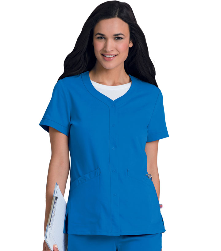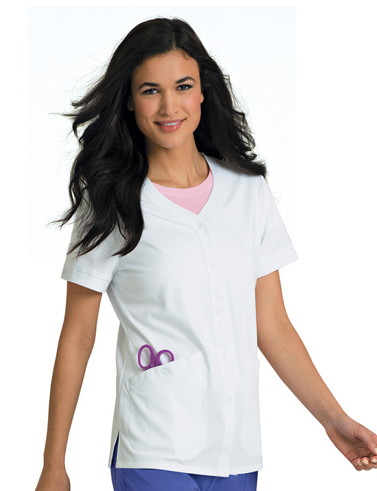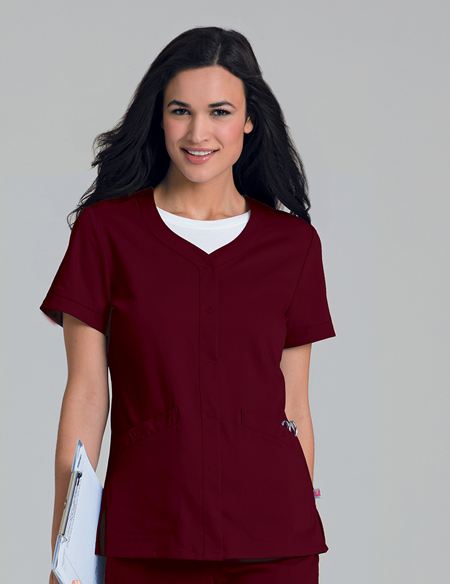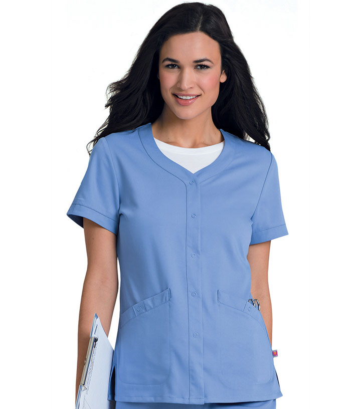 Banded sleeve-hem is accented with a nonfunctional snap tab