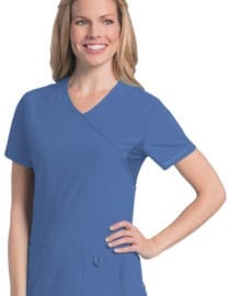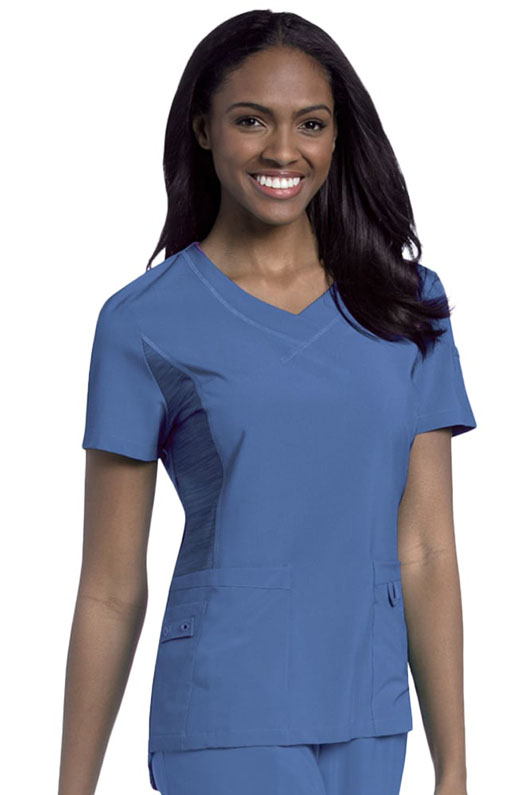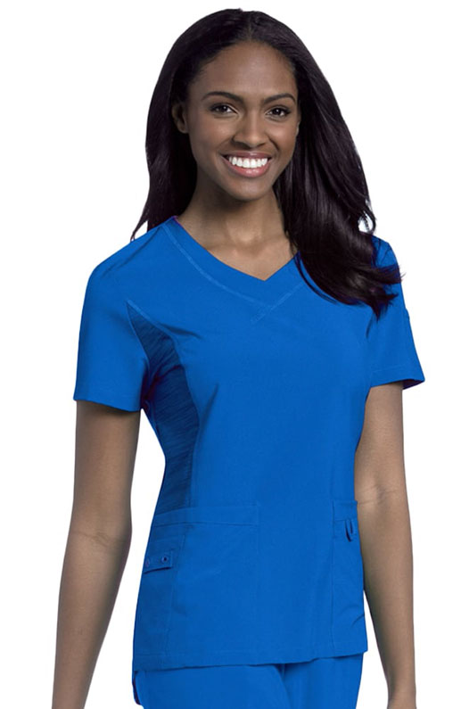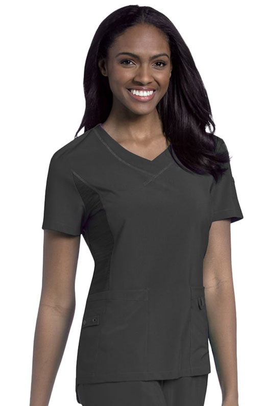 Urbane Performance Women’s Curved Knit Panel V-Neck Solid Scrub Top. Knit panels provide added stretch and subtly wick away moisture.